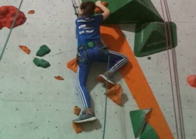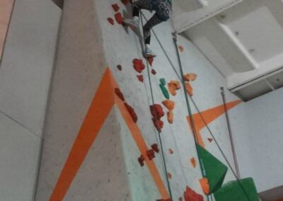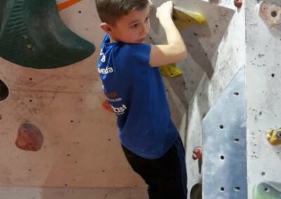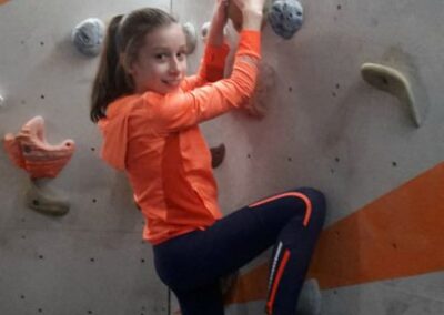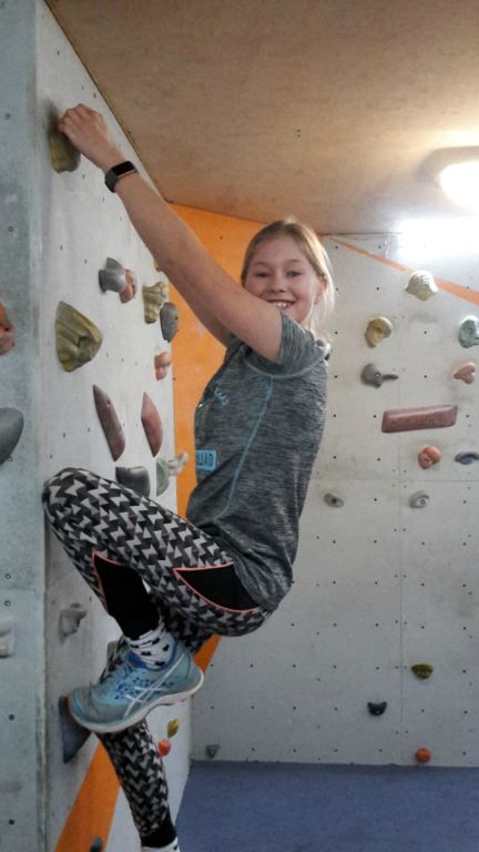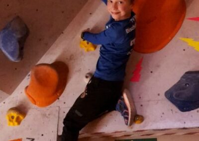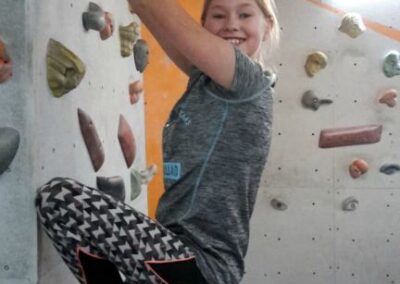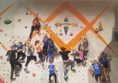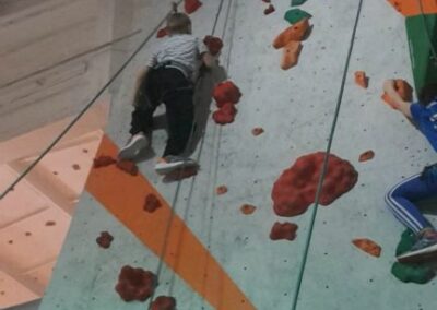 Für 2 Stunden ging es entweder in Absprunghöhe an vielen Boulderstrecken in die Hallenwände oder die Kinder versuchten sich mit Sicherungspartner an echten Kletterrouten bis in 8 m Höhe.