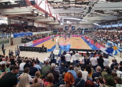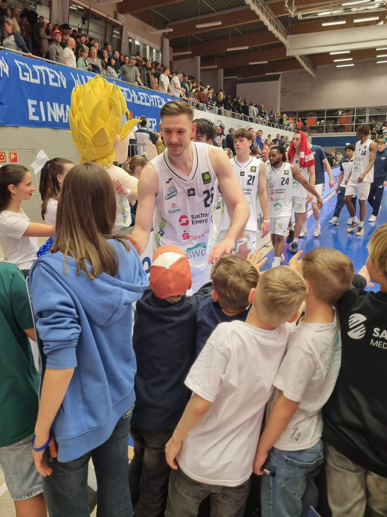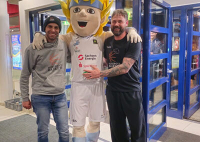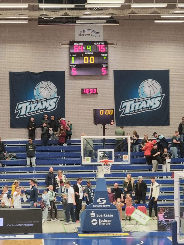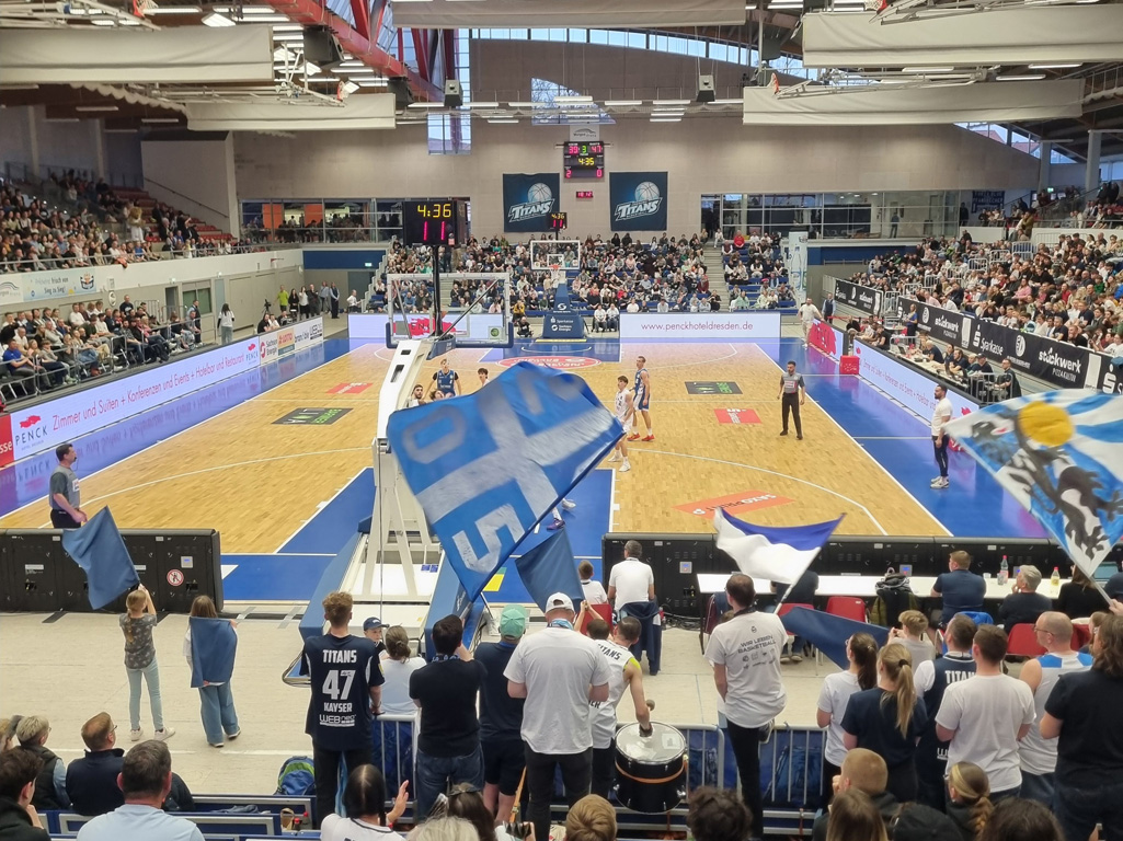 Anlass war das letzte Heimspiel der regulären Saison der Dresden Titans gegen die BBC Coburg. Für viele unserer jüngsten Talente war es der erste Besuch bei einem Profi-Spiel – und die Erwartungen wurden nicht enttäuscht. In einer sehr gut gefüllten Arena herrschte von der ersten Sekunde an eine elektrische Stimmung.